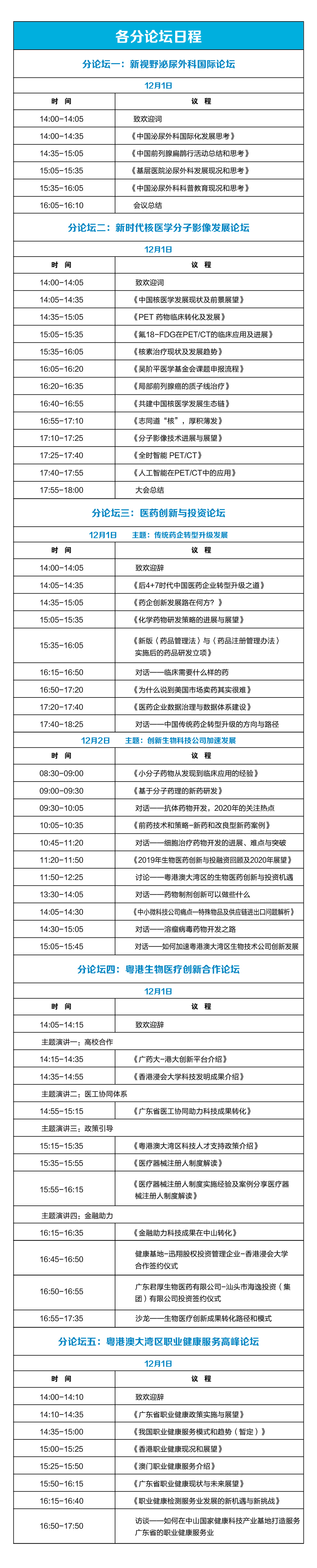 論壇開幕式和頒獎(jiǎng)大會(huì)后將舉行五個(gè)分論壇,其中有兩個(gè)分論壇是由吳階平醫(yī)學(xué)基金會(huì)主辦的醫(yī)學(xué)學(xué)術(shù)論壇,分別是新視野泌尿外科國際論壇和新時(shí)代核醫(yī)學(xué)分子影像發(fā)展論壇,將分別探討我國泌尿外科和核醫(yī)學(xué)的發(fā)展之路。另外三個(gè)分論壇均由中山方面舉辦,分別是醫(yī)藥創(chuàng)新與投資論壇、粵港生物醫(yī)療創(chuàng)新合作論壇,以及粵港澳大灣區(qū)職業(yè)健康服務(wù)高峰論壇。三個(gè)論壇與產(chǎn)業(yè)發(fā)展密切結(jié)合。醫(yī)藥創(chuàng)新與投資論壇匯聚醫(yī)藥界領(lǐng)軍人物,圍繞中國傳統(tǒng)藥企轉(zhuǎn)型升級和粵港澳大灣區(qū)的生物醫(yī)藥創(chuàng)新與投資機(jī)遇,探討資本市場助力,賦能傳統(tǒng)藥企,創(chuàng)新藥物研發(fā)與多元化資本金融結(jié)合的產(chǎn)業(yè)創(chuàng)新模式;粵港生物醫(yī)療創(chuàng)新合作論壇以醫(yī)療器械注冊人管理制度的具體實(shí)施、科技成果轉(zhuǎn)化范例等話題,聚焦香港高?蒲谐晒、廣東醫(yī)工協(xié)同創(chuàng)新聯(lián)盟、金融科技助力等科技成果轉(zhuǎn)化中的關(guān)鍵要素資源展開討論,推動(dòng)在中山構(gòu)建“灣區(qū)技術(shù)+金融創(chuàng)新+中山落地產(chǎn)業(yè)化”模式;職業(yè)健康論壇重點(diǎn)就職業(yè)健康服務(wù)業(yè)的發(fā)展創(chuàng)新、促進(jìn)職業(yè)健康相關(guān)產(chǎn)業(yè)發(fā)展進(jìn)行深入研討,交流探索新時(shí)期職業(yè)健康服務(wù)業(yè)的實(shí)踐路徑和發(fā)展模式,助力健康灣區(qū)建設(shè)。