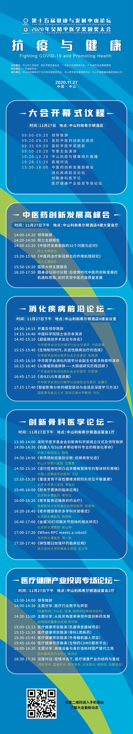11月27日,第十五屆健康與發(fā)展中山論壇、2020年吳階平醫(yī)學(xué)獎頒獎大會將在中山市隆重召開。