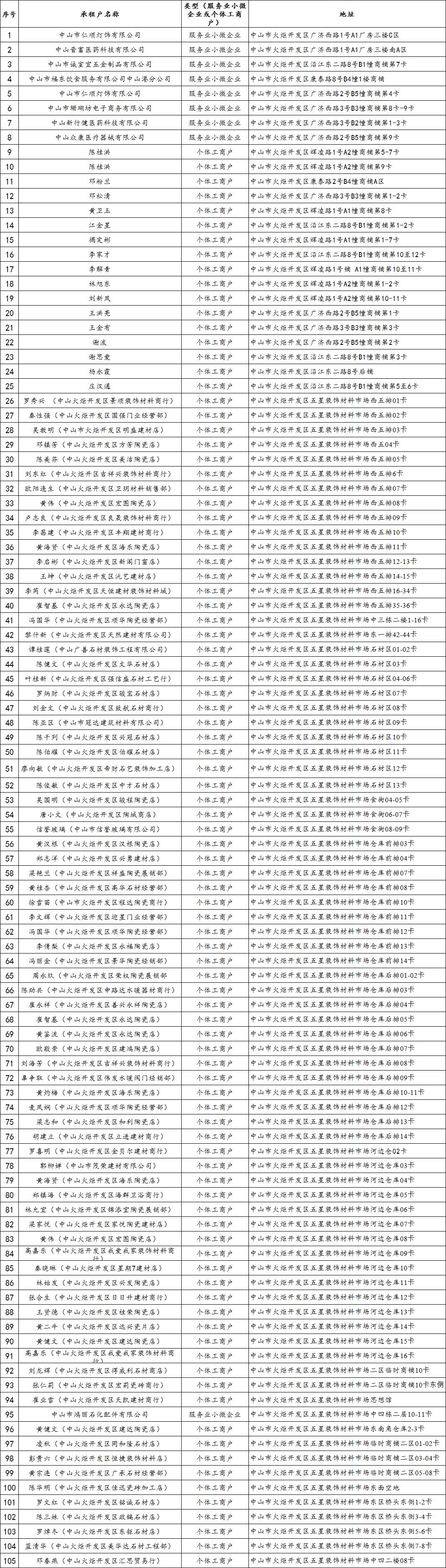 符合減免條件的承租戶名單如下(中山市健康基地集團(tuán)有限公司和中山火炬工業(yè)聯(lián)合有限公司符合條件的下屬物業(yè)均已包含在內(nèi)):