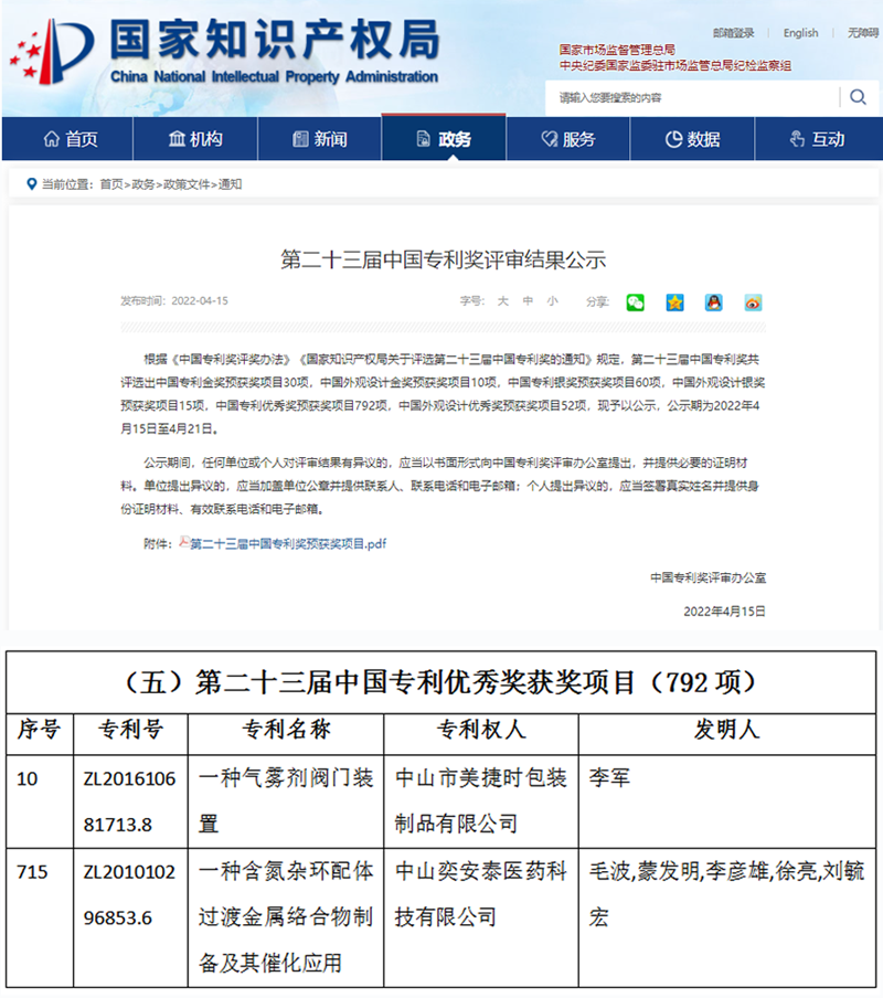 近日,中國(guó)專利獎(jiǎng)評(píng)審辦公室完成第二十三屆中國(guó)專利獎(jiǎng)公示,健康基地園區(qū)3家企業(yè)項(xiàng)目上榜,其中中山奕安泰醫(yī)藥科技有限公司(以下簡(jiǎn)稱“奕安泰”)和中山市美捷時(shí)包裝制品有限公司(以下簡(jiǎn)稱“美捷時(shí)”)等公司榮獲中國(guó)專利優(yōu)秀獎(jiǎng)。