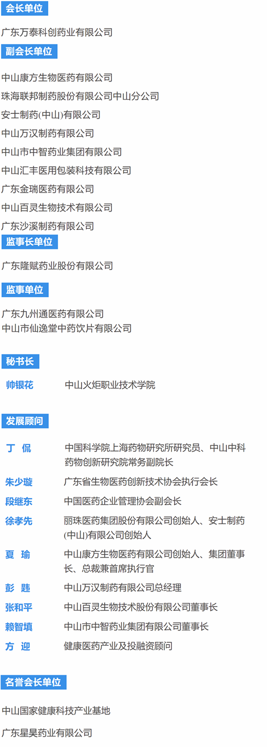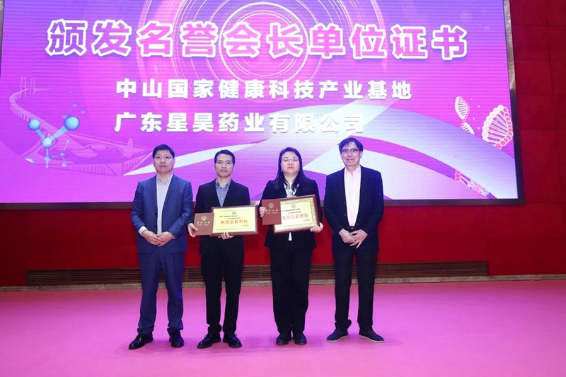 大會共產(chǎn)生了33個理事單位、3個監(jiān)事單位,選舉了會長單位、監(jiān)事長單位各1個,副會長單位1個、秘書長1名,并聘請了9名發(fā)展顧問,授予了中山國家健康科技產(chǎn)業(yè)基地和廣東星昊藥業(yè)有限公司為名譽(yù)會長單位。