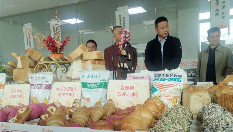 在南方新元公司新品展示臺(tái)上,擺放著各式各樣由該公司酶制劑改良方案的“漢堡包”“南方刀切饅頭”“開花大包”“老面饅頭”等新品。