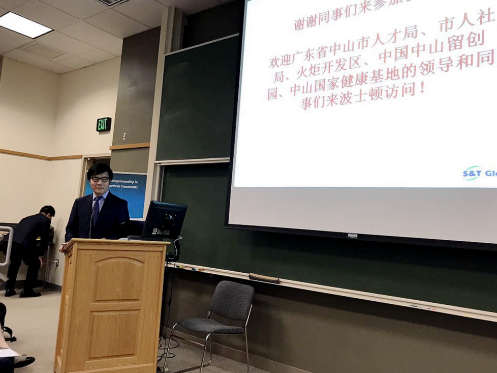 美國當(dāng)?shù)貢r間5月3日,由中山市委組織部副部長黃紅全、火炬開發(fā)區(qū)黨工委副書記黎漢釗率領(lǐng)的中山市招才引智考察團一行來到美國波士頓,在哈佛醫(yī)學(xué)院學(xué)術(shù)報告廳舉辦了“廣東中山生命健康產(chǎn)業(yè)投資環(huán)境波士頓推介暨項目對接會”(下稱:波士頓推介會)。市人才工作局常務(wù)副局長劉劍亮、市人社局副局長黃志國等參加活動。