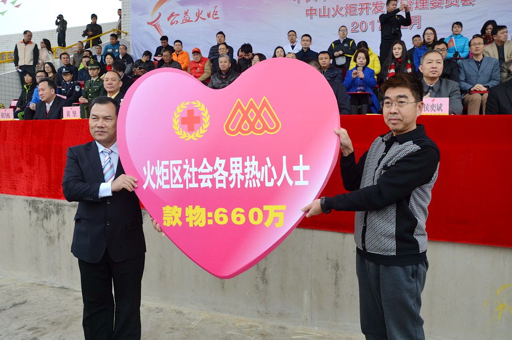 咀香園健康食品(中山)有限公司首席技術(shù)官張延杰代表火炬區(qū)社會各界熱心人士向火炬區(qū)紅十字會捐贈款物660萬元