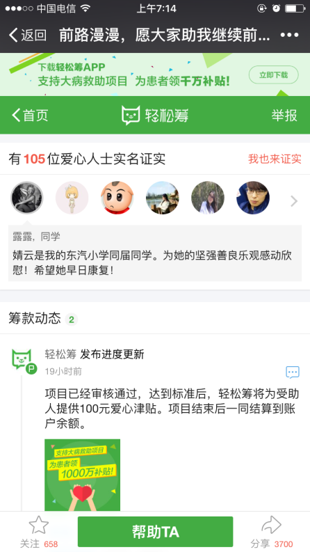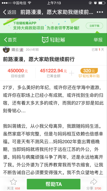 10小時的陸續(xù)接力,小蔣的籌款超過了預設金額45萬元。那一刻,我們悄悄松了一口氣:只愿我們的行動能如熹微曙光,照耀她前行的路。