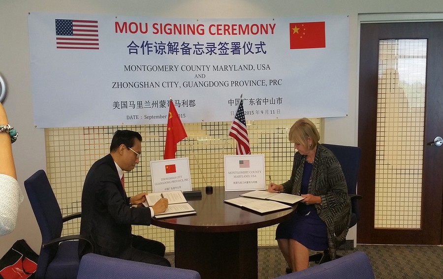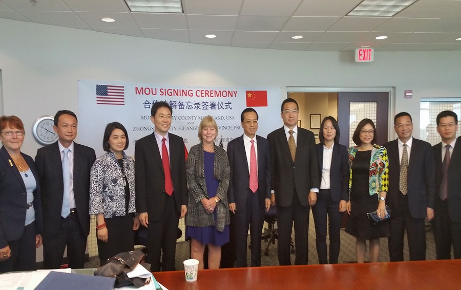 美國當?shù)貢r間9月11日,在蒙哥馬利郡(下稱:蒙郡)政府,中山市委副書記、市長陳良賢與蒙郡政府簽署了《友好合作協(xié)議書》。雙方就未來多個層面尤其是健康醫(yī)藥產業(yè)的合作交流展開探討。中山招商經貿團成員共同見證簽約儀式。